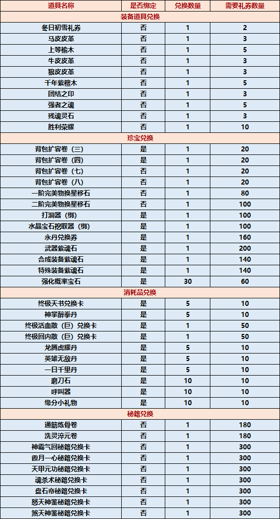 冬日初雪宝盒:活动期间开启宝箱,有几率随机获得以下道具之一,神紫晶精华*1、魔晶精华*1、紫晶七星石*1、祝福强化卷轴*20、祝福强化卷轴*30、祝福强化卷轴*50、祝福强化卷轴*100、永丹兑换券*1、永丹兑换券*3、强化概率宝石*100、神兽精元兑换券*1、水晶宝石挖取器*1、打洞器*1、紫晶石兑换卡*1、免死金牌*2、龙腾虎耀丹*2、神掌醉拳丹*1、一日千里丹*3、英雄无敌丹*3、磨刀石*5、羽化神秘经验丹*1、羽化神秘武点丹*1、落跑符*5、千里传音*5、移行换位符*1、终极天书兑换卡*3、加速药水兑换卡*1、神行符*3、传送卡*3、随身镖局*2